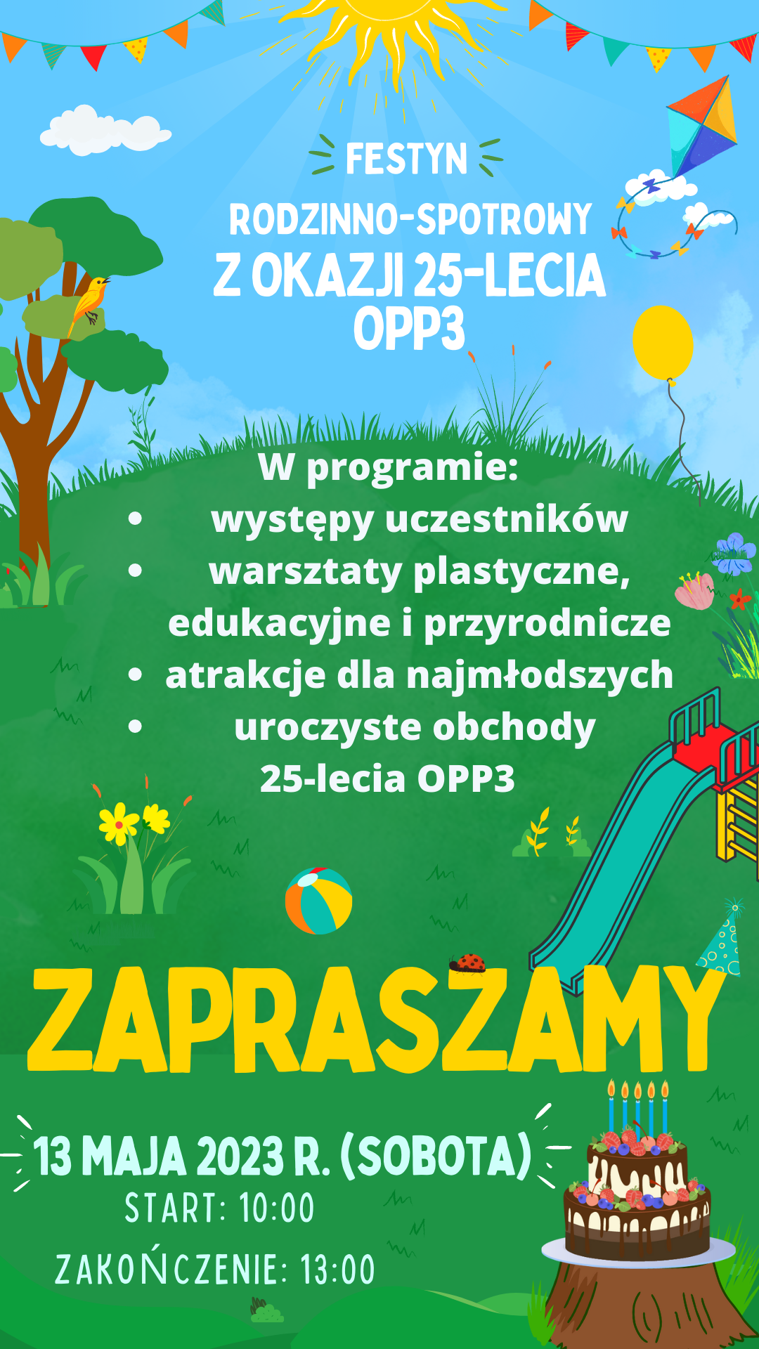 Festyn z okazji 25-lecia OPP3!!! W dniu 13 maja (sobota) w godzinach 10:00-13:00 serdecznie zapraszamy wychowanków, rodziców i opiekunów na Festyn rodzinno-sportowy z okazji obchodów 25-lecia Ogniska Pracy Pozaszkolnej nr 3. Festyn będzie miał miejsce w ogrodzie na terenie OPP3.
